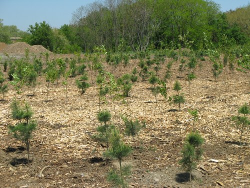 One of the woodland areas, here obviously dominated by pine (three species). The soil seen in the left background is glacial till from several hundred feet below the surface, excavated elsewhere in the city and reused here. The wood chip mulch is from blow-downs caused by last year’s deadly tornado and micro-burst.