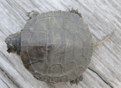 This youngster came from an egg laid last year; it spent the winter underground, to emerge this spring. That’s the way they do it in the northern states. (Two years ago, I found a live baby painted about the same time of year) This one, alas, never made it to water.