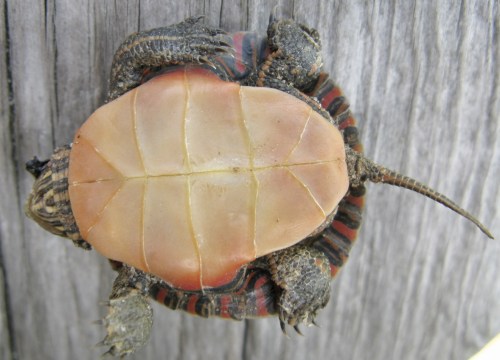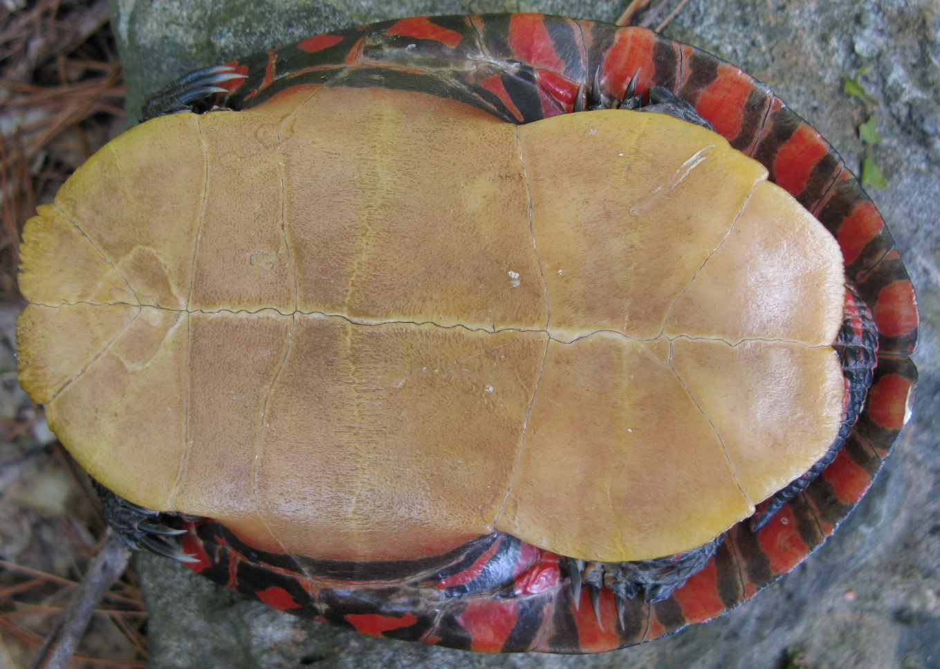 We found this one on the road right outside the Ipswich River Wildlife Sanctuary last week. I hopped out of the car to get it off the road. The turtle immediately pulled in all its extremities, tucking its tail along the side, which was nice since the claws are sharp. (Some turtles will squirt you, so beware!) Took a quick picture of its underside before putting it on the safer side of a stone wall. Size here is about 5.5 inches long.