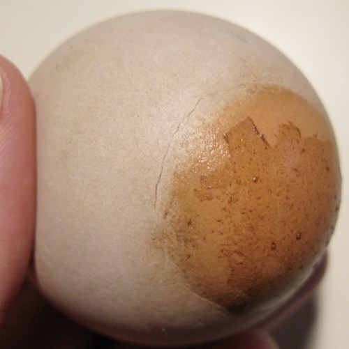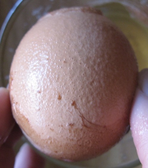 24 hours later, I could squeeze the now-rubbery egg. A genuinely creepy sensation, indeed. The shell residue simply came off on my fingers; I rinsed the rest of it off for the following shot: