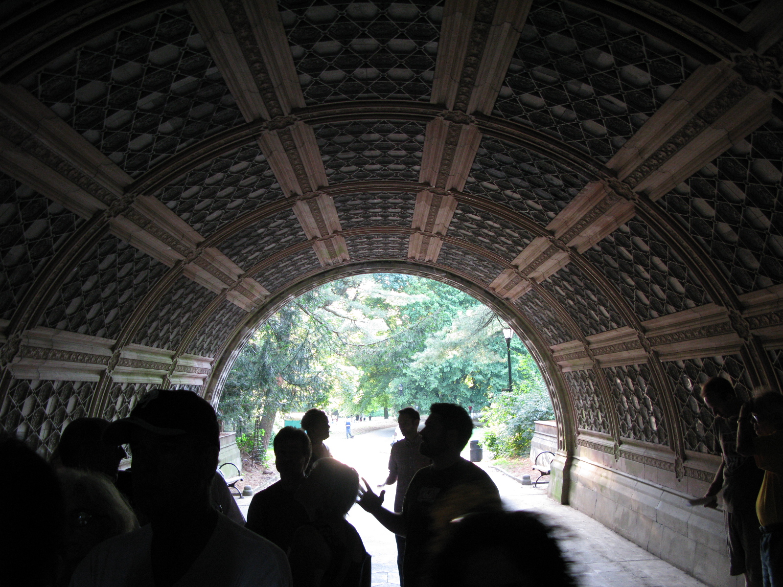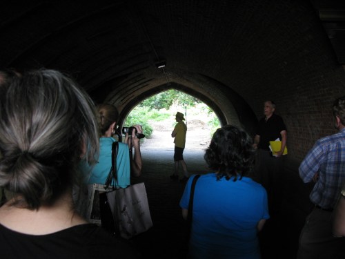 Yesterday, the delightful Christopher Gray, (on right with yellow folder), the New York Times Streetscape columnist, led a walk through the park’s wonderful arches: Endale, Meadowport, Neathermead, Cleft Ridge, and East Wood. His recent column bemoaning the state of the arches was the impetus for the gathering. The arches were designed to separate pedestrians from horse-borne, and now infernal combustion, traffic; they were designed to provide shelter from inclement weather (Meadowport still has its benches); and they were designed to be dramatic: beautiful wood, newfangled concrete, and, for Endale (originally Enterdale) and Meadowport, the stage-like views opening out onto the Long Meadow. (It would behoove you to look up Tony Hiss’s essay on this experience)