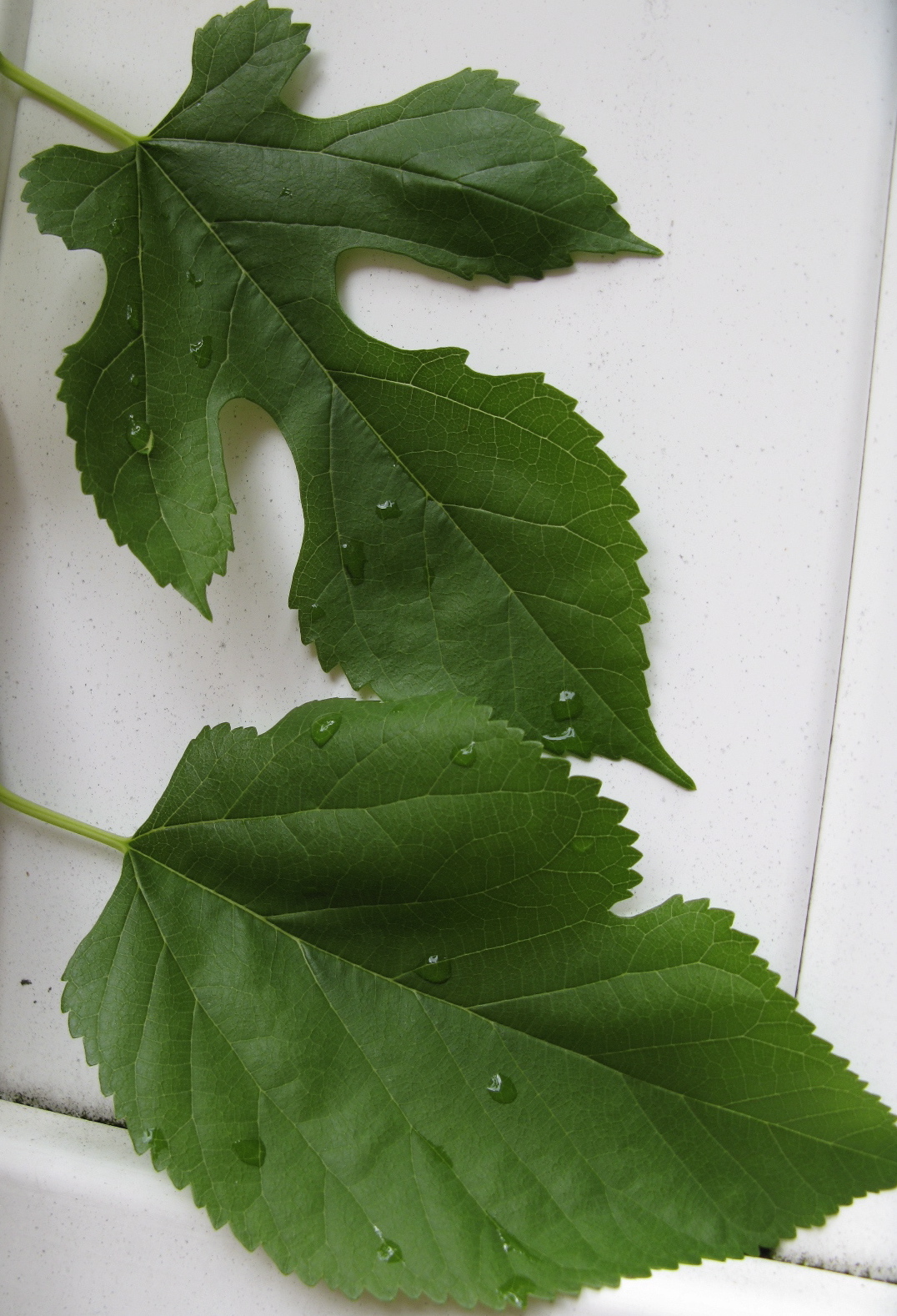 Complicating matters is that there are many cultivars and hybrids of both red and white mulberries. But, since the leaves are rough on top, like sandpaper, I’ll put my tentative bet on red mulberry. White mulberry leaves are shiny and smooth.