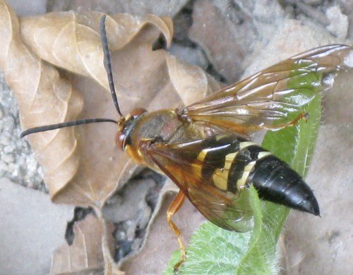 Since our annual cicadas are about two inches long, these predatory wasps are big. Most of these looked to be just under an inch and half; they are the largest wasp species in our area. Now, they’re relatively harmless to us, but quite intimidating to the unknowing (I’ve seen people run), so I hope the panic-stricken and/or ignorant don’t notice these and call the exterminator.