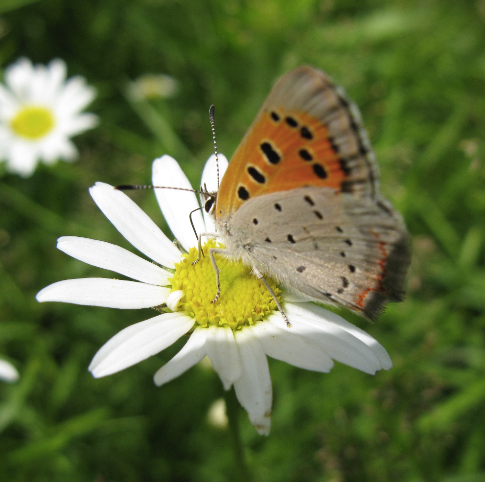 American Copper, Lycaena phlaeas. Another name for them is Flame Copper. They are small and vivid.