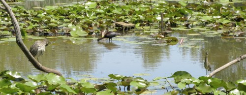 Through the blind at Big John’s Pond: Black-Crowned Night Heron (Nycticorax nycticorax, a juvenile), Glosy Ibis (Plegadis falcinellus), and Green Heron (Butorides virescens). Three Wood Ducks (Aix sponsa) were in there as well, but not visible here.