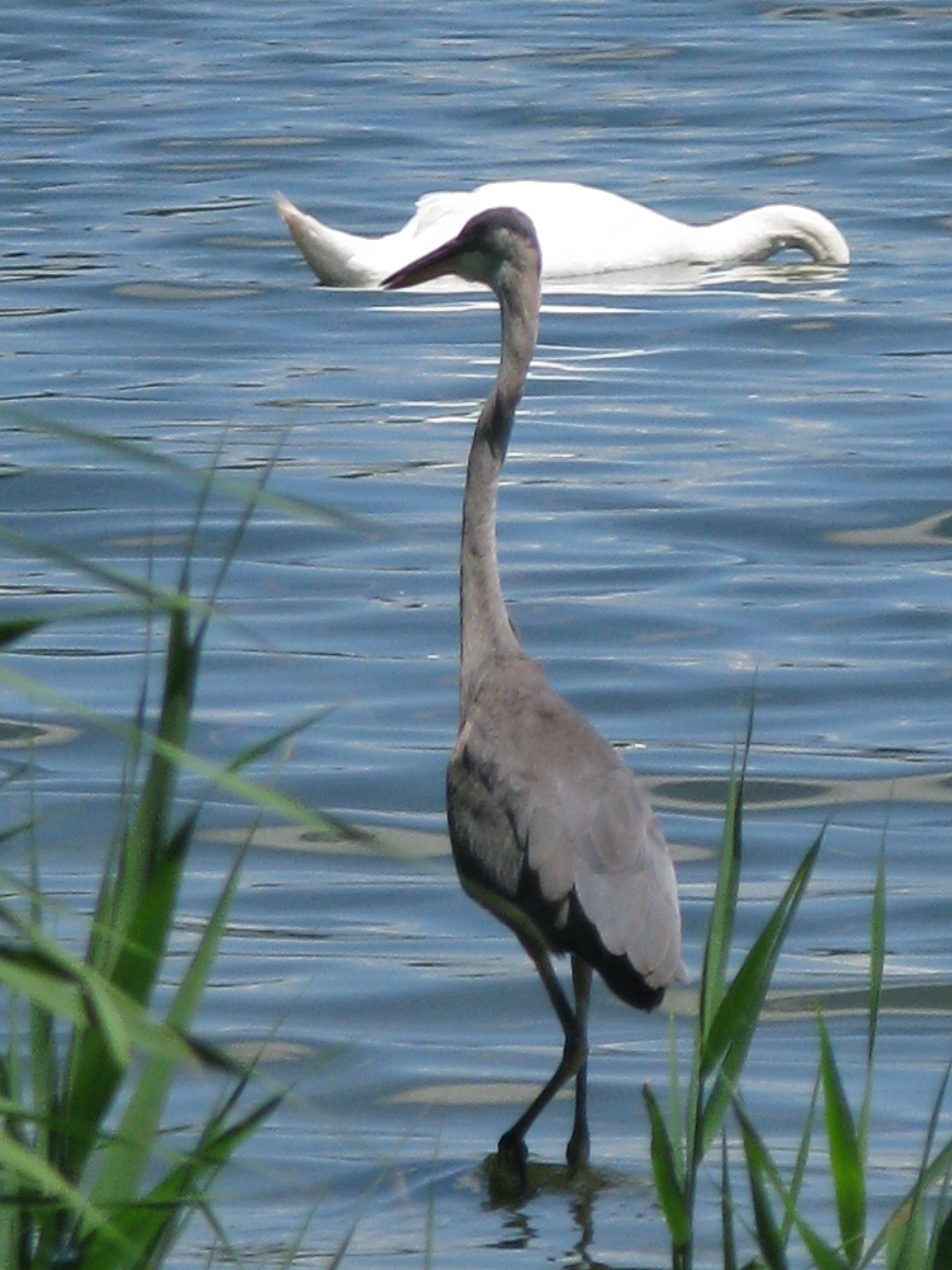 Great Blue Heron (Ardea herodias) and Mute Swan (Cygnus olor) on the East Pond at Jamaica Bay Wildlife Refuge.