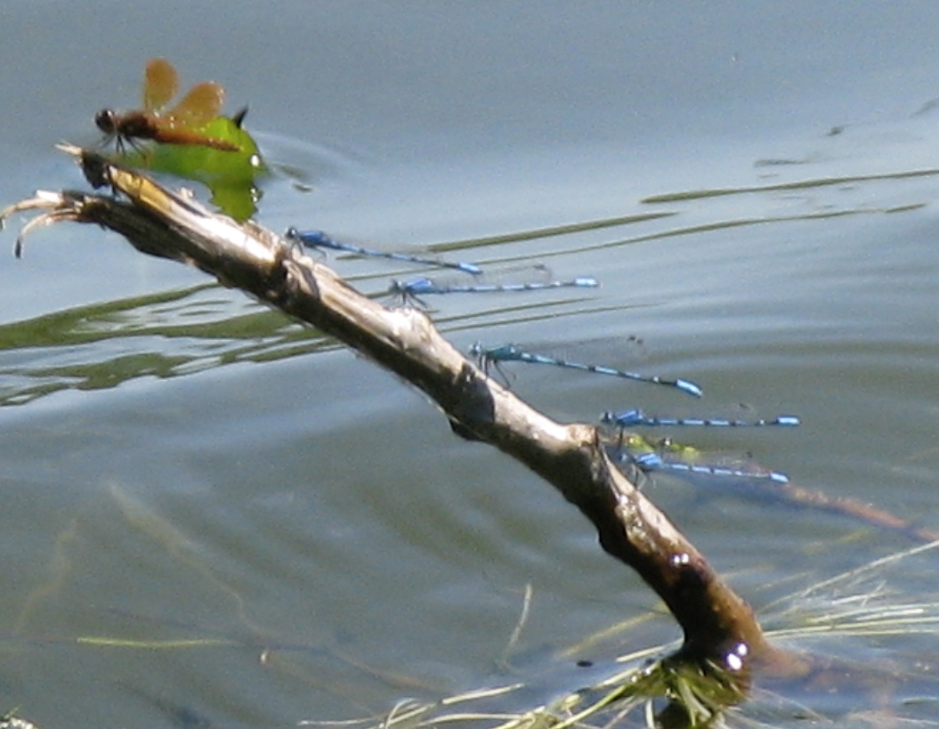 Eastern Amberwing (Perithemis tenera), the smallest of our dragonflies, and some kind of bluet damselfly (genus Enallagma) perching.