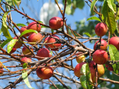 Here I am planning to cross a highway on-ramp while not being run over, dodging masses of pigeon droppings under an overpass, noticing a fruit on the sidewalk. Looking up. A tree heavy with fruit in what’s essentially a traffic island. Something Prunus. The slender, slightly curving leaves are characteristically peachy, the smooth fruit less so. But then, P. persica, the peach tree, has over 2,000 named fruiting cultivars! Including nectarines, like these. Nectarines are essentially fuzzless peaches, caused by a recessive gene, but now cultivated and marketed as a separate fruit (and, sadly, mostly grown for transportation, not taste).