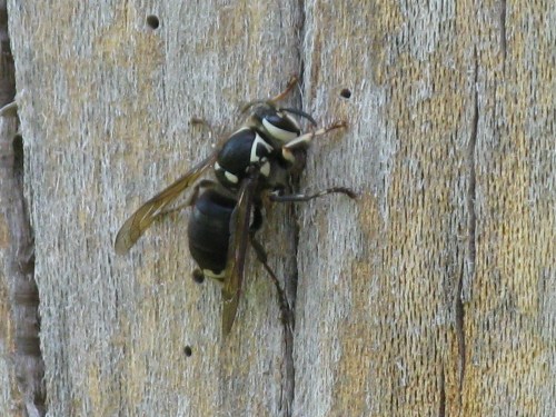 Bald-faced hornet (Dolichovespula maculata). These are the social wasps that make the large, football-shaped paper nests you see in trees, especially in winter. The nests are completely inactive in winter and unused the following year. The wasp is chewing the old wood of this tree; it’s how they make the paper of their nests. Most of the nests are grayish, like this old wood, although I have a piece of one that is a rather lovely red and gray.