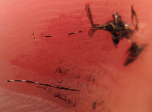 Sorry, Jainists. Note the b&w striped legs of what remains of this Asian tiger mosquito in a pool of my Achilles heel blood. The striping is the inspiration for their common name.