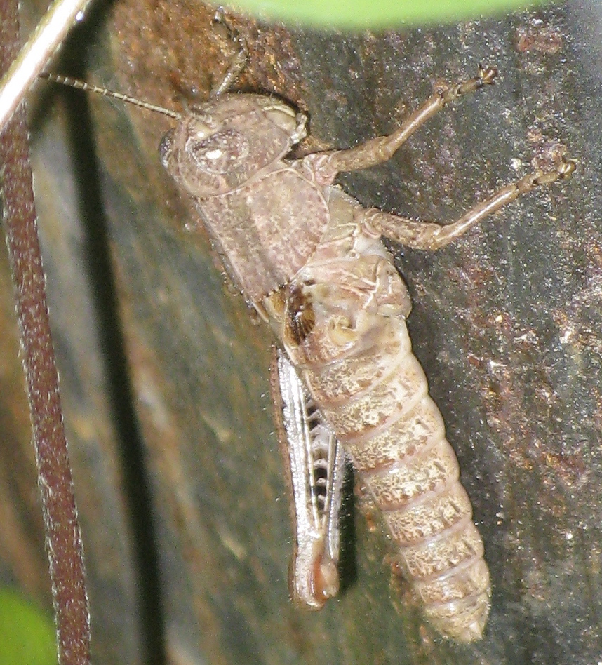 Right outside the backdoor, meanwhile, clinging to a metal column: a grasshopper missing one of its hind, jumping, legs. And yet seeming to get along.