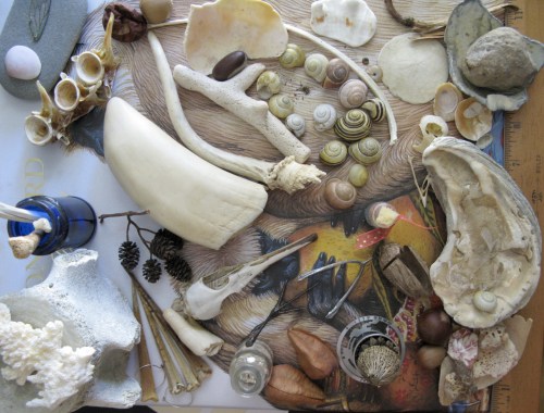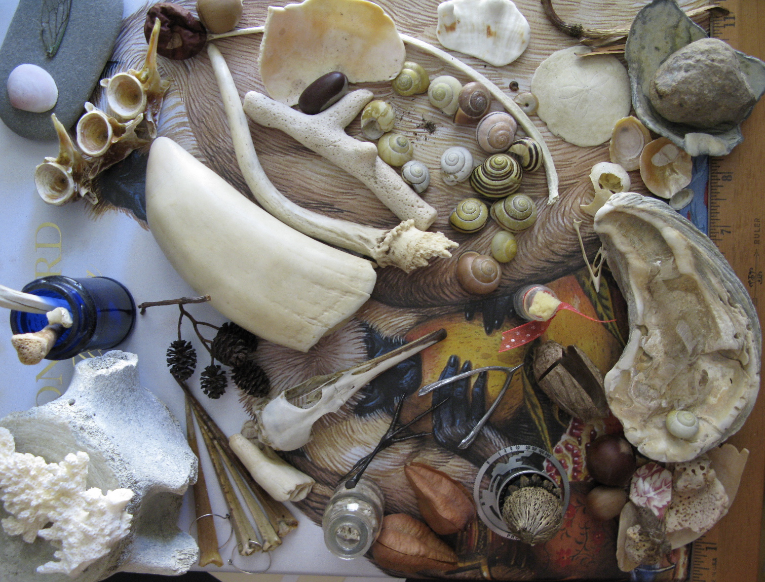 I’m a big fan of cabinets of curiosities. My bookshelves, and other parts of my apartment and the Back 40, where the big turtle shell is to be found — I really want to make sure those carrion beetles are good and done with it — have essentially become my cabinet.