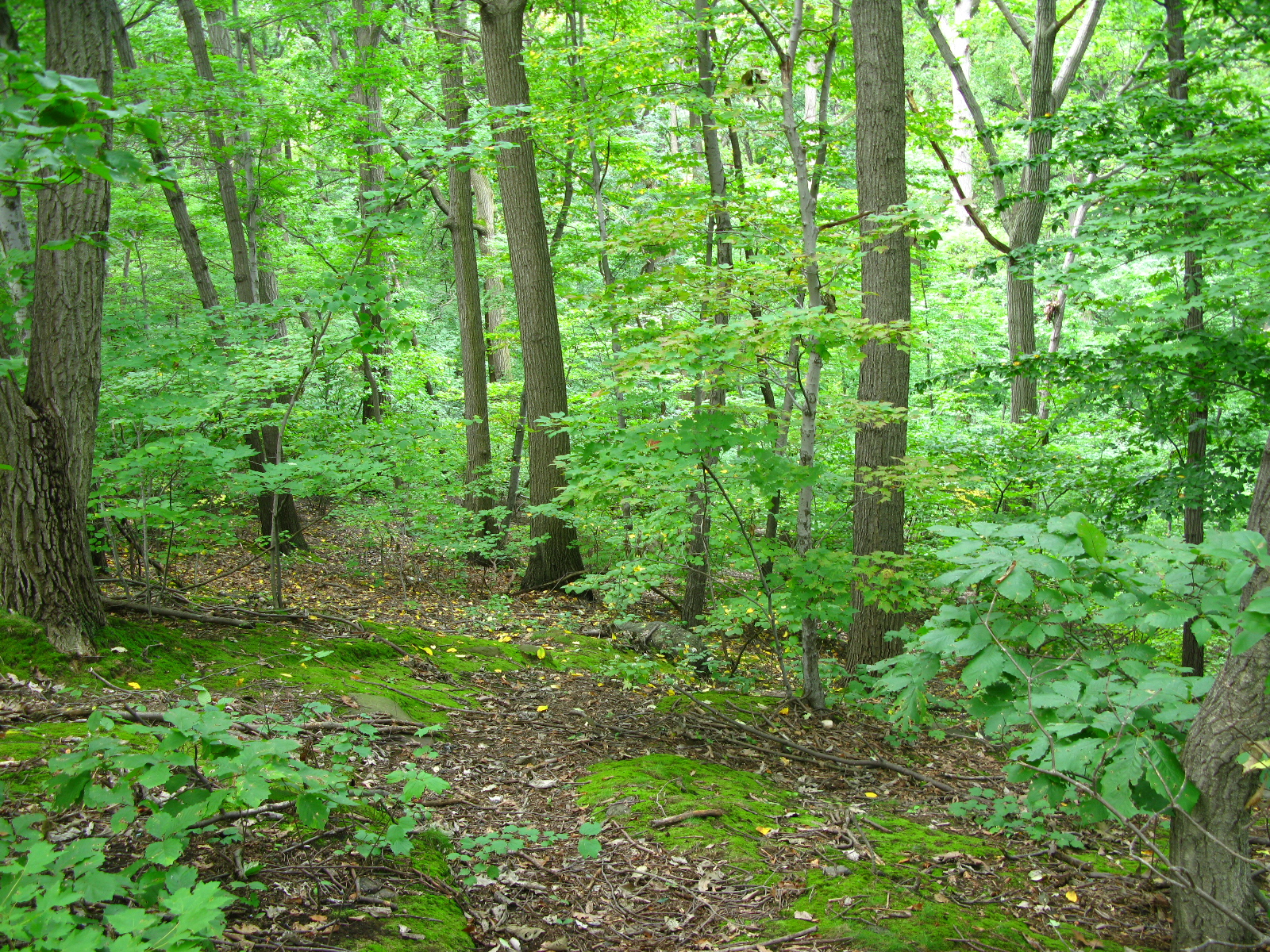 Down the hill from here, the massive boles of tuliptrees, our forest giants, and the cathedral heights of mighty oaks. It was a cloudy morning, with spotlights of sun breaking through. The green is most intense on days like this, soft and glowing, but already the serviceberries are yellowing. It was the last hurrah before the Fall.