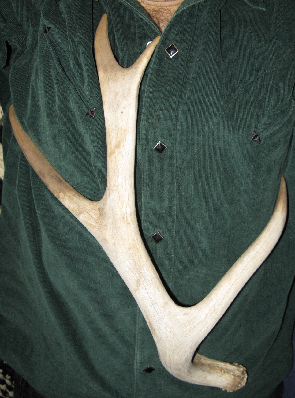 I found this mule deer antler in the bosque near Los Vegas, New Mexico.* I have been dancing around the cave with it ever since, throwing strange shadows on the wall. (While I have some sympathy for Bohemian imp Joe Gould’s definition of “My Religion” — “In winter I’m a Buddhist/In summer I’m a nudist” — I generally veer more towards the animist.)