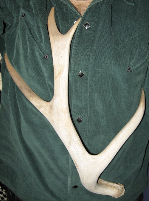 Yes, I confuse my Horns and Antlers, since people have been using them for similar things for years, as totems, as medicine, as media. But they are different anatomically. Horn is sheathed in keratin, similar to our fingernails, and surrounds a bone core. Antler is pure bone; the “velvet” that coats young antlers is a kind of blood-rich skin, nourishing these fast-growing structures. Deer shed their antlers every year. As the buck — only males grow them — matures, it grows a more elaborate set each year as it ages, branching into more and more “points,” or tips, the hunter’s phallocentric prize. Bonanzas of calcium, shed antlers are usually absorbed back into the life cycle rather swiftly by tiny digesters, animals, and the weather.