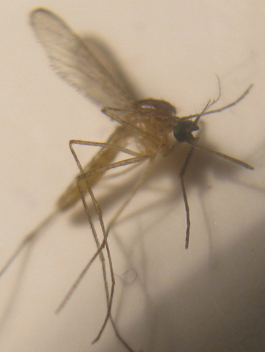 It was a tough night on the skeeter front. Approximately eight bites amongst the two of us, and so far three mosquitoes, including this early afternoon kill. Hard to tell here, but the eyes have a blue-green iridescence to them. Possibly the southern house mosquito, Culex quinquefasciatus (brought north by the warming climate?). Definitely not an Asian Tiger.