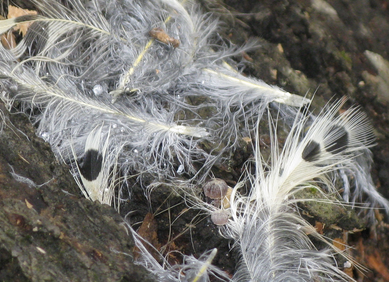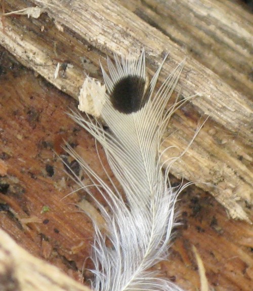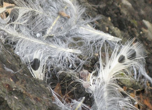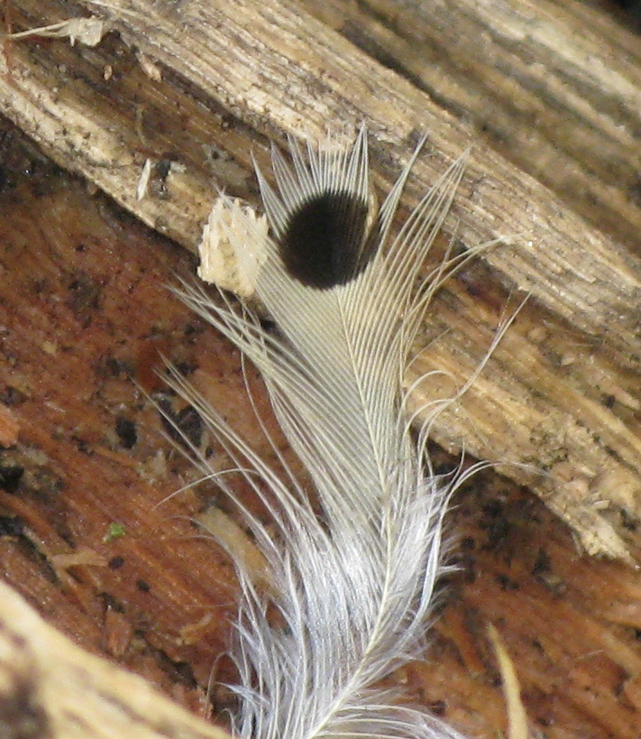 A storm-toppled tree in the Ravine in Prospect Park made a natural bridge for squirrels and chipmunks before it was sliced up. The horizontal trunk was also being used for a plucking station, as these remains attest. The main predators of birds in the park include other birds, raccoons (but mostly of nestlings), and cats. These are contour feathers, which cover the underside of a bird, especially the breast, where most of the muscle (and hence meat) is on a bird.
