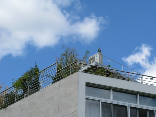 Most of the bogus pigeon scarers are “owls,” as if any self-respecting owl would be hanging out in the middle of the day. This one was a raptor. A nice variation on the theme of useless bird flushers. Right across the street however, a sound in the trees where Vinegar Hill actually drops off, surprisingly, about 20 feet, attracted me. Probably squirrel, and I think it was pissed because of this: