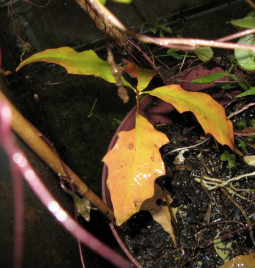 I left the remaining sapling alone for four months. Yesterday, in the rainslush, I suddenly noticed its leaves turning. One of its five leaves had already fallen. Time for a picture before it was too late: