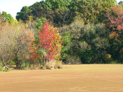 The Upper Pool’s duckweed, emerald green in summer, has darkened.