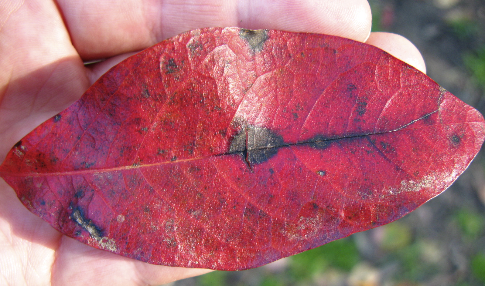 Returning to the red theme, glossy variation: there is a magnificent Black Tupelo, Nyssa sylvatica, (a.k.a. Blackgum, Sourgum, etc.) near the Boy Scout/Teddy Roosevelt plaque. Eyeballing it, I would say it is one of the fattest-boled trees in the park.