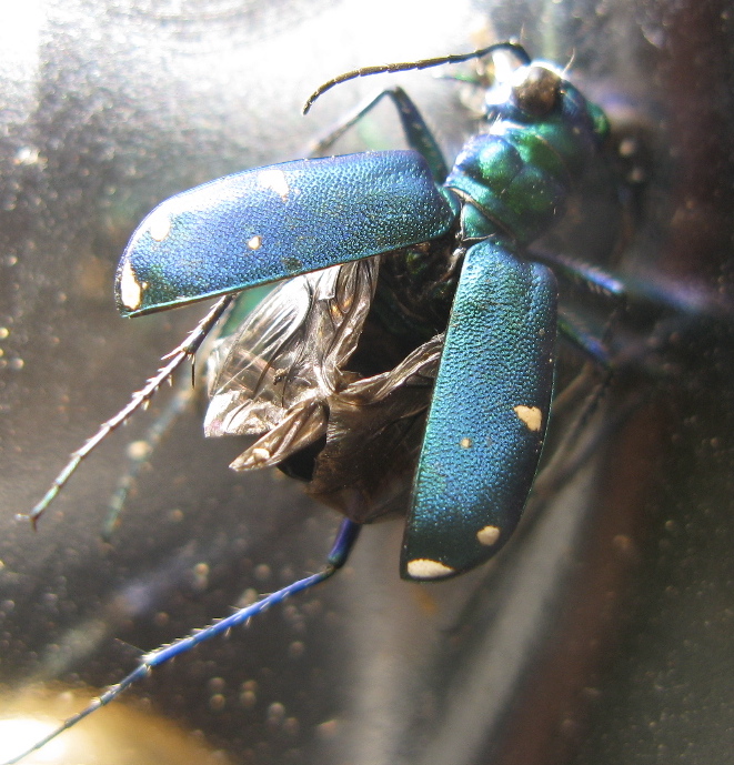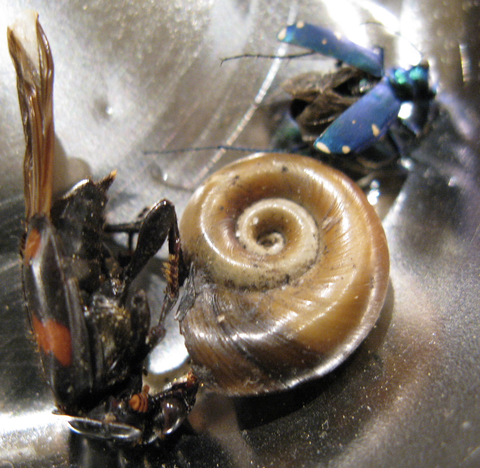 Burying beetle, Nicrophorus orbicollis. Gray lancetooth snail, Haplotrema concavum (I think). Six-spotted tiger beetle, Cicindela sexguttata.