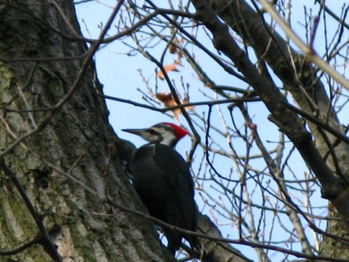 There were only a smattering of winter-hardy birds like chickadees and nuthatches up there that brisk November morning, so this Pileated woodpecker, Dryocopus pileatus, or Grand pic to the Francophones, announced itself as a pleasant surprise with great thudding taps. At one point, it paused to listen to some other great thudding sounds made by nearby construction.