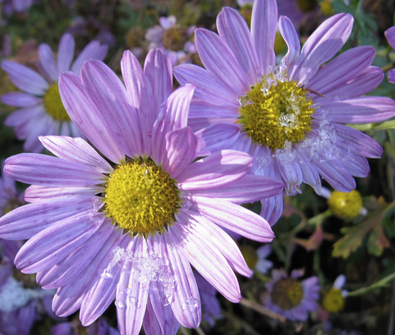 A very light dusting of snow on the grounds could not daunt these well-named Arctic daisies, Arctanthemum arcticum, Chrysantheme arctique.