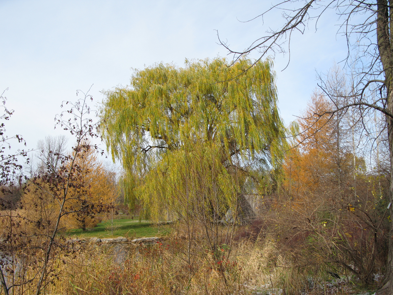 A grand old weeping willow tenaciously holds out against the Fall. I must visit again in September, or, better yet, June.