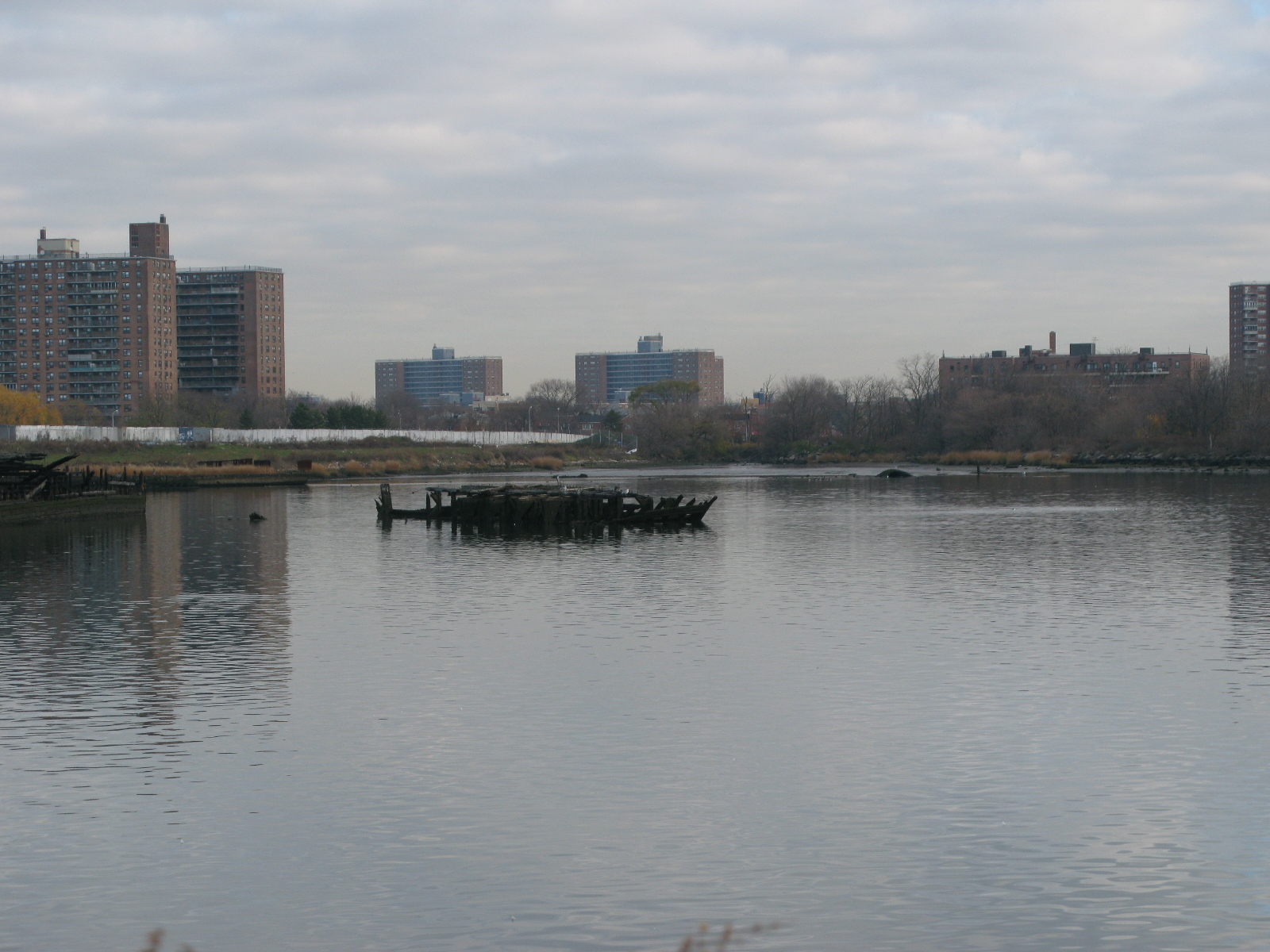 Coney Island Creek this morning before the sun came out. Old barges … a home-made submarine, shopping carts, toxic muck. Pigeons: check. Rats: check, a longshoreman-sized one amid the rocks who turned around to give me the beady eye.