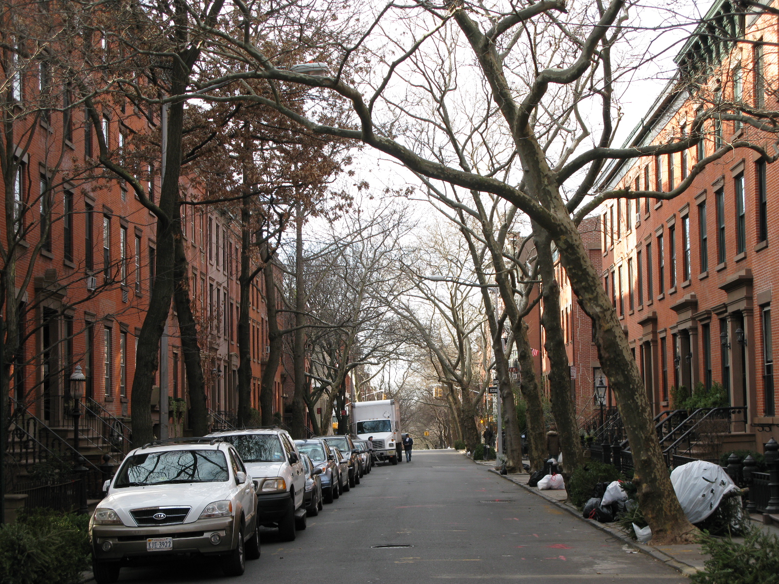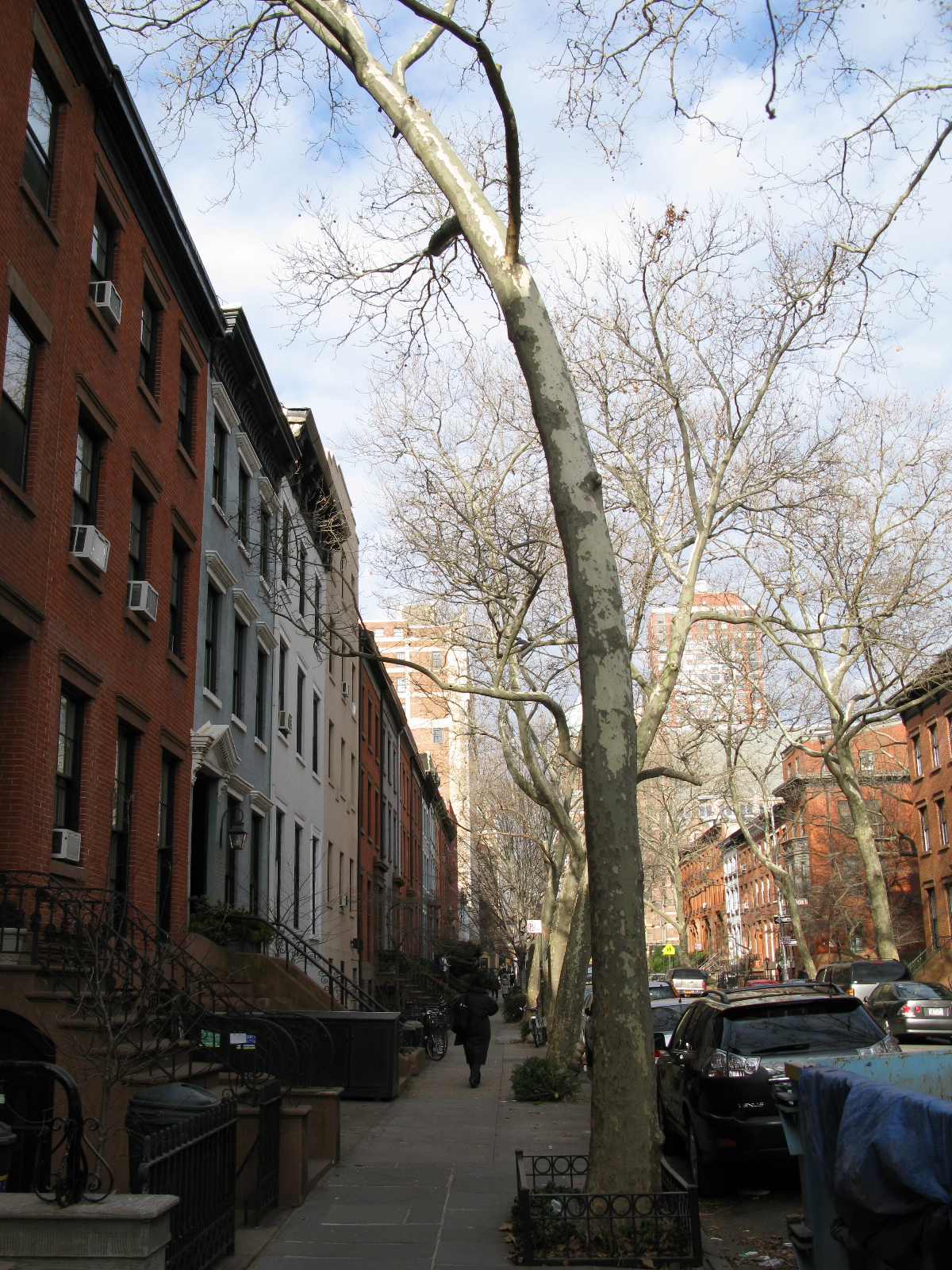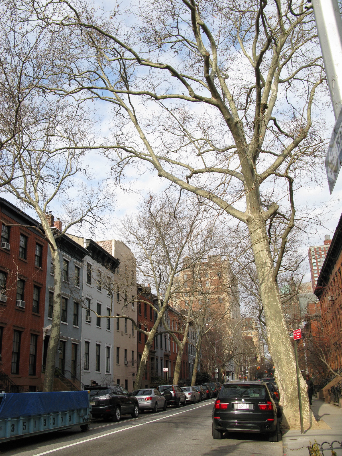 But what I really wanted to bring to your attention is the fact that Planetrees are highly phototropic. They move towards the light. On our streets, this is manifested by the trees arching over towards the center of the street and away from buildings. In the picture above, a half dozen Planetrees on one side of the street bend towards the relatively straight trunks of other tree species on the other side of the street (there is one Planetree on the left side). A downside of this tendency is that the trees are not correspondingly autophobic, so the sometimes sharp angle of the trunks means they can be gouged by delivery trucks, Suburban Utility Vehicles, and other monstrously inappropriate civilian tanks.