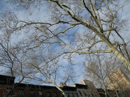 Across the street is an enormous — it has the biggest bole in the ‘hood — older Planetree that, in angling upwards, has “pushed” the younger one away from it. As the tree grows, it senses where the light is, even where the light is only marginally better, and moves accordingly. Location, location, location, it’s all about the “view” of the light.