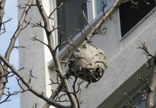 A paper nest made by Bald-faced hornets, Dolichovespula maculata. Found a block down the street from the Back 40. It’s quite empty this time of year. Next year’s already mated females are somewhere nearby, tucked into over-wintering nooks, hoping to become queens of new colonies/nests. They will not reuse this nest.