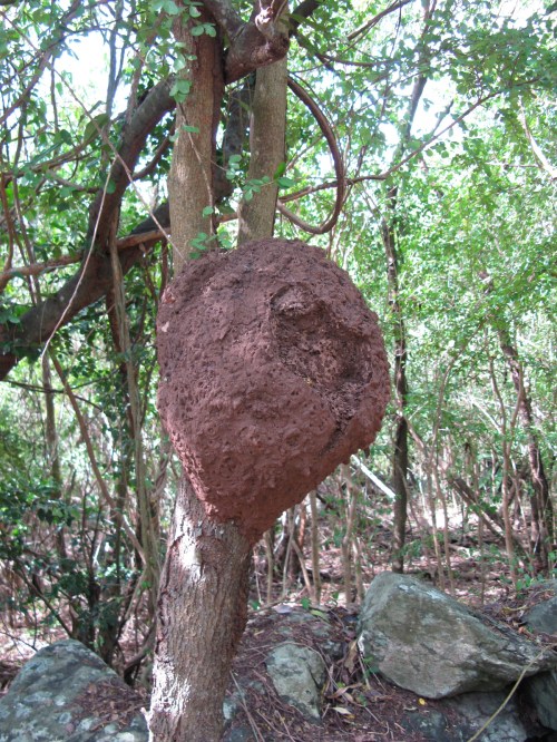 One of the ubiquitous arboreal termite colonies, or termitaria, found on the island. Known locally as wood lice or wood ants, this Nasutitermes species builds large nests of partially digested wood pulp mixed with their own saliva and feces. The material looks like mud from a distance. The nests are often found broken up on the ground, brought down by their own weight. Here’s a chunk of the brittle, friable nest: