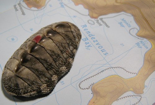 Even though we have at least one species of chiton, or coat-of-mail shell, in our northeastern waters, I’ve never come across one. The eight plates, or valves, that make up the shell usually break apart and scatter to the waves. This one was actually in a pile of shells placed as decoration in the villa we stayed in at Klein Bay.