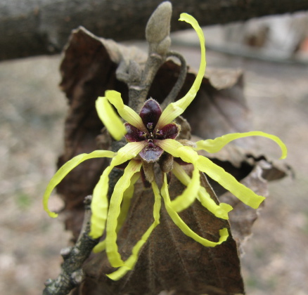 But wait, there was more. The Chinese witch-hazel was blooming, not even bothering to have complely shed its old leaves: