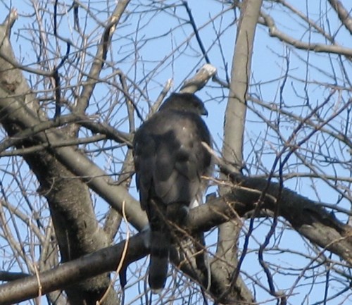 Approaching the bird feeders in Prospect Park, I heard several Blue Jays screeching. The feeders themselves were completely abandoned, which is a sure sign of something going on, although there were Downy Woodpeckers, House Finches, Red-winged Blackbirds, and Mourning Doves all around in the trees. The male Red-wings are generally one of the earliest birds to return north in the spring, but some will stick around through a mild winter like this one. They generally don’t vocalize this early, but these boys were wound up. They all knew what the Blue Jays knew.