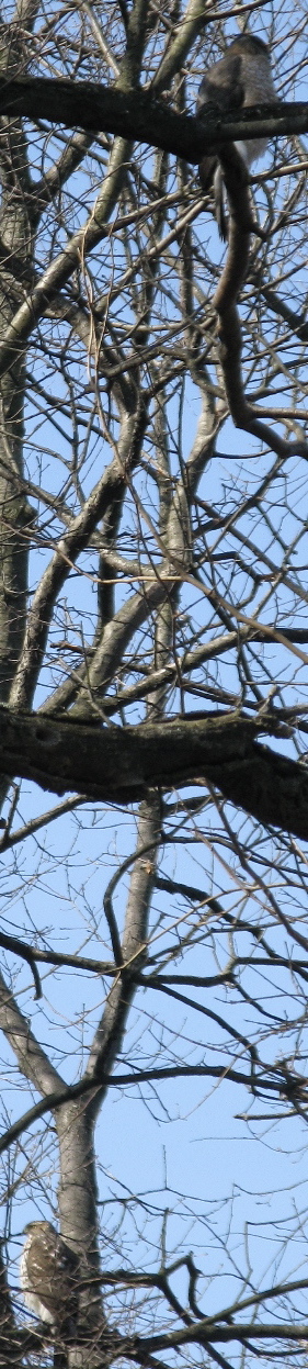 While watching this Cooper, and the active, vocal song birds in the area (though they totally boycotted the feeders), I saw a juvenile Red-tailed Hawk make a pass over the feeders, which also attract squirrels.
