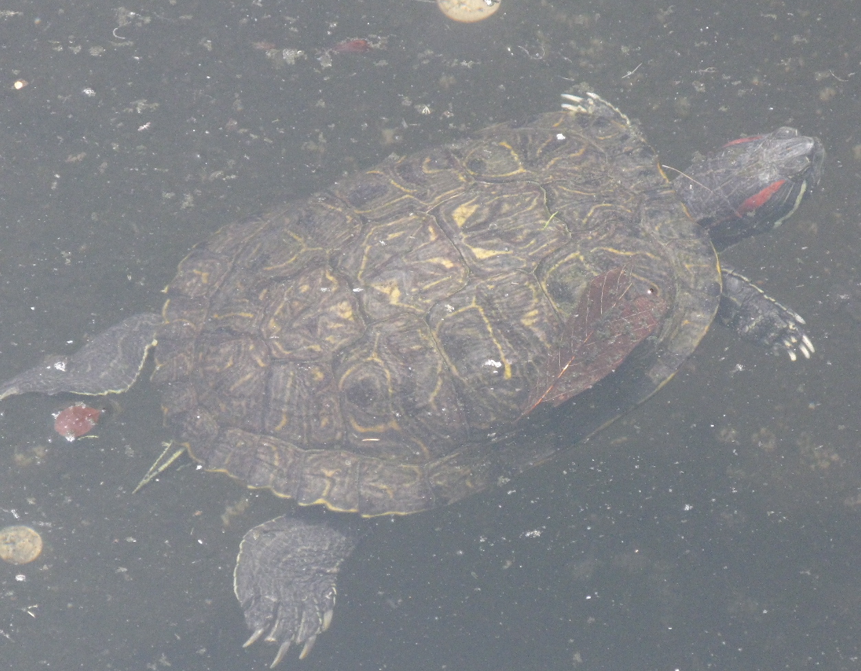 The Red-eared Slider is the common pet trade turtle, often sold in itty-bitty, evidently irresistible (and, if under 4″, plainly illegal) form. But of course, if the animal is lucky — although plenty of them die young — it grows bigger and bigger and bigger. A female can get to be the size of a large dinner plate, the males nearly that big. A native of the southeastern U.S., these sliders have become invasive in our region through releases from people who didn’t realize how big they could get, could no longer afford the increasing care costs (a very large tank is necessary for a plate-sized turtle), got bored with it, or otherwise outgrow it themselves (children are obviously cute-baited by the trade). Besides out-competing native species like the Painted Turtle, every release is a potential biological hazard, since it could introduce disease(s) to local turtle populations.
