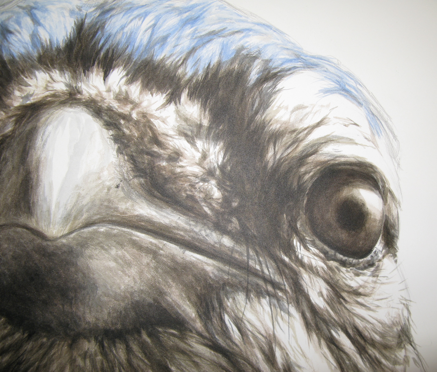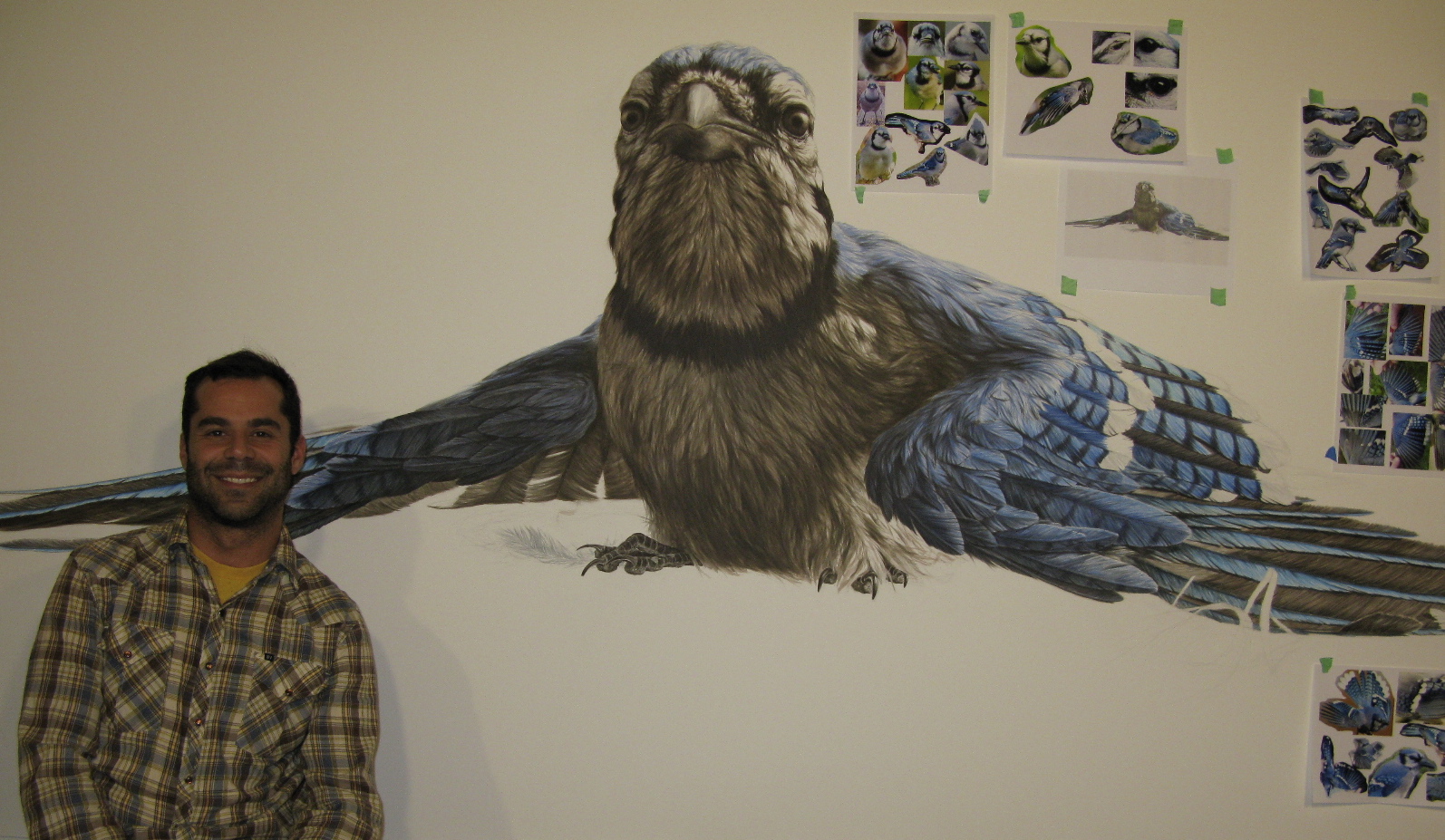 Above is a detail of a drawing by George Boorujy. You may recognize it as a close-up of a Blue Jay. You may also have some sense of the size of this relatively common bird (which is also highly vocal). It’s bigger than a House Sparrow, smaller than an American Crow. About this image, though, you may be hard-pressed to have a sense of the size of it. Because it does exist on paper, not just digitally. Is it field guide-sized, life-sized, poster-sized?