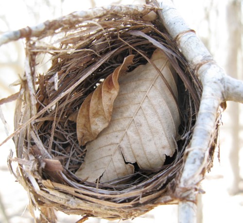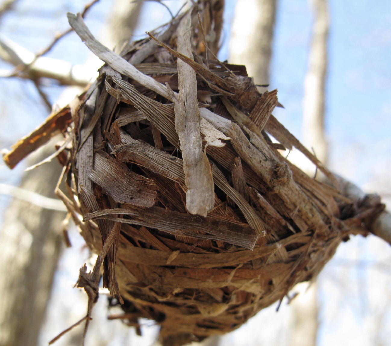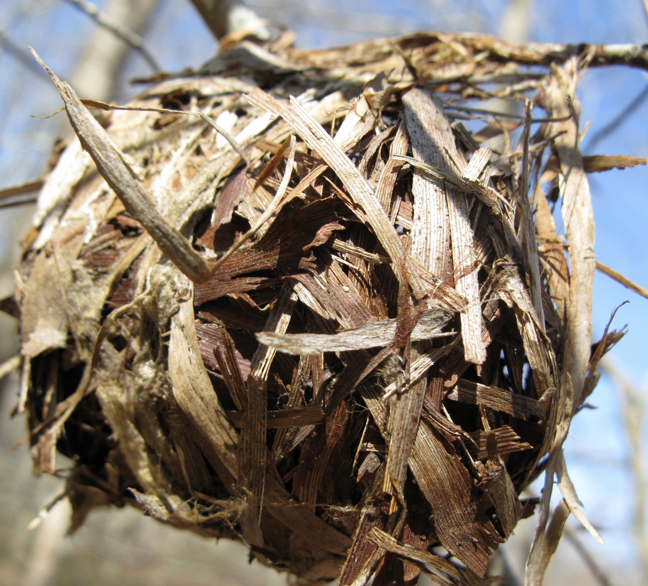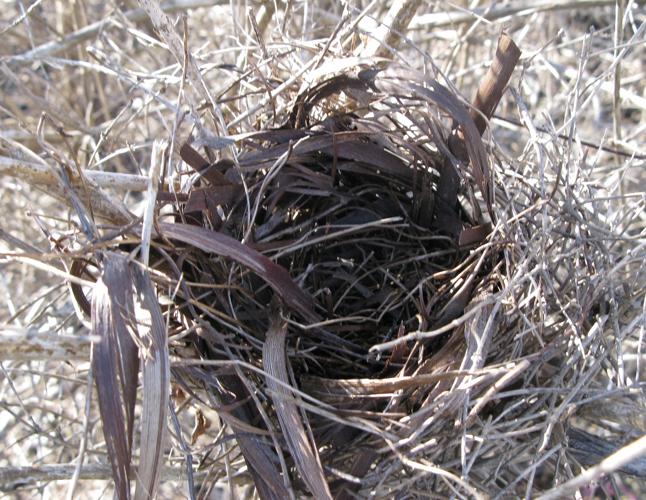 Probably the most common bird nest come across is the American Robin’s, which is big for a song bird’s, and characteristically made with a mud base and a lining of grasses. Of course, birds don’t want you, or any other predator, to find their nests, so the leafless season is best for discovering them. Of course, months after being abandoned, nests are usually in a bedraggled way, and many don’t survive the winter. But this mild winter seems to have been gentle on last spring’s nests. I found these three woven cups on Nantucket last week. Help me to identify them.