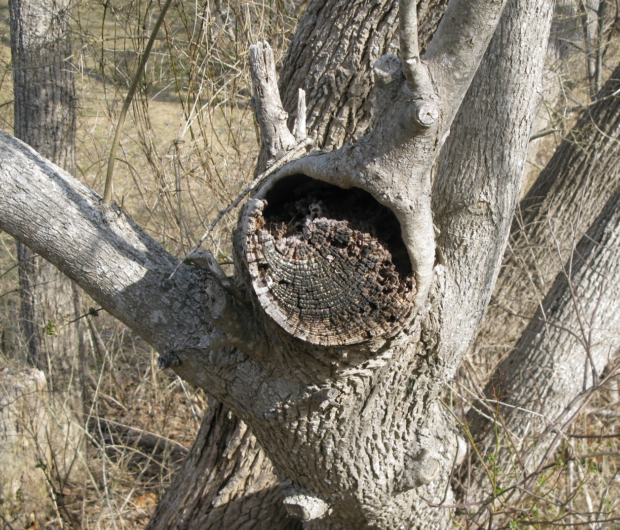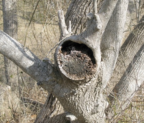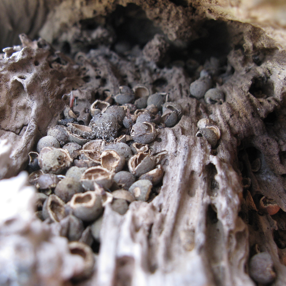Yesterday, we saw a bird’s nest that had been reused as a cache for seeds. Here’s another little hideaway, which was also probably stocked in the fall by one of the several species of mice that inhabit our noctural woodlands.