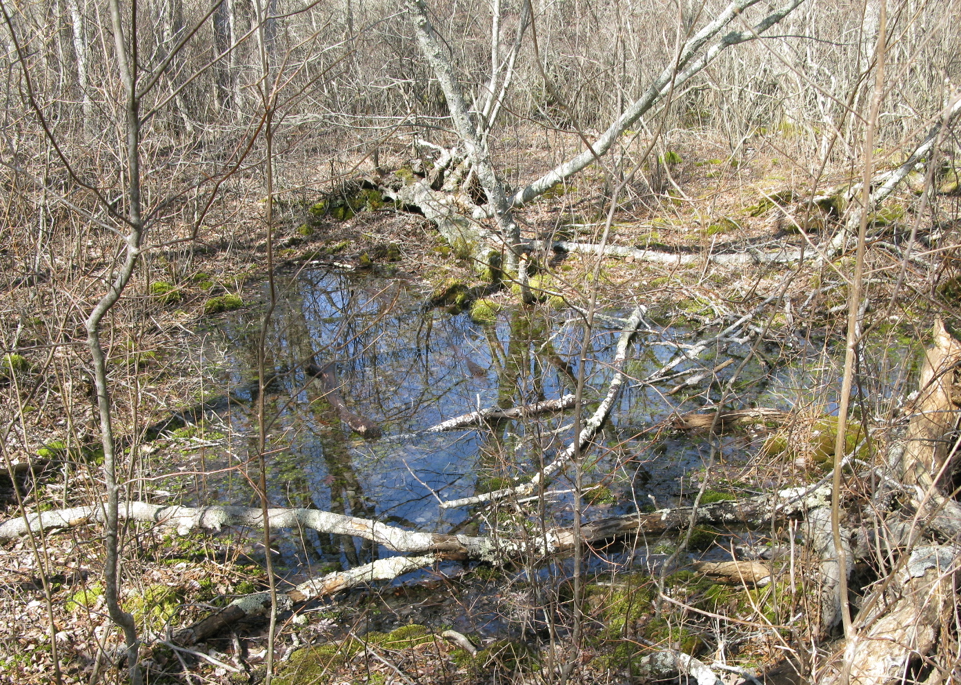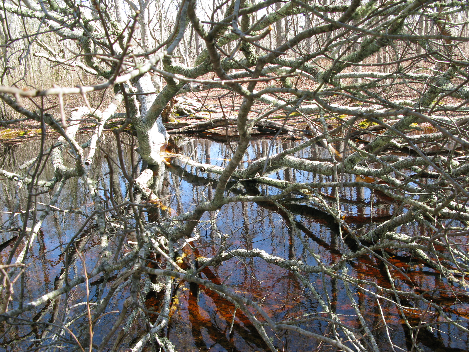 Vernal pools, a rare-for-the-island running stream, and sphagnum/peat bogs testify to the swampiness of the terrain. Plants adapted to water-saturated soils, as well as high acidity in the peat, and animals adapted to intermittent water abound. Areas of higher elevation show how soils dictate habitat as well, as trees that can not survive with flooded roots congregate on the well-drained upland soils. The lumpy landscape was created by the last ice-age and subsequent weathering of kettles (valleys) and kames (hills), with clays beneath, which help to explain the presence of moving and standing water. Fiercely windswept, the island’s woodlands do best as “sunken forests,” protected in the old kettles. The vernal pools, which dry up in summer, are vital to the life-cycle of reptiles, amphibians, insects, and other invertebrates like fairy shrimp, all dependent of fish-free fresh waters.