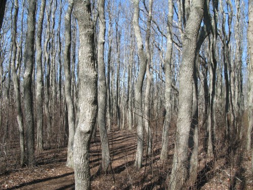 Hardwood forests are rare on Nantucket now, but the island had a lot more before Wood Age peoples from Europe cleared it for construction and fuel and to make way for agriculture starting in the 17th century. (“Wood Age” is my own coinage here; they were replaced by those Coal/Oil Age peoples also known as us.) A relatively uniform woods like this should be familiar to anyone who’s ever been on a highway on the eastern end of this country. The similar-sized trees here — oaks, mostly, but also hickories, beech, tupelo, maples — tell you that this land was also once cleared; a mature forest would have trees with a greater variety of sizes as old giants fall and open up the canopy to saplings waiting for their chance.