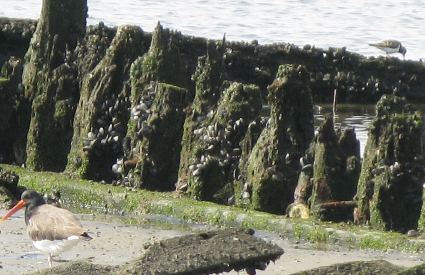 We saw our first American Oystercatchers, a species that breed in our region (and yet another reason to make sure your dogs are leashed on the beach), of the year, as well as a single Ruddy Turnstone, still in its non-breeding plummage. The old pier here supports plenty of blue mussels and other goodies.