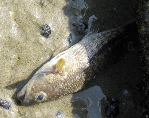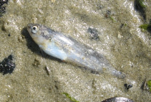 The rock-like black objects blurred by sand in both the above images are actually mud snails, Ilyanassa obsolete, which will eat these fish corpses if something else doesn’t.