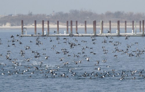 This is a transitional time, with both winter and spring bird species finding themselves rubbing shoulders, so to speak. The large raft of Greater Scaup that winters here is still around, although they will be heading north to breeding grounds soon. The raft wasn’t so big when we first arrived in the mid-morning, but as we stood there wave after wave of birds flew in, their massed wingbeats making a most extraordinary liquid sound.