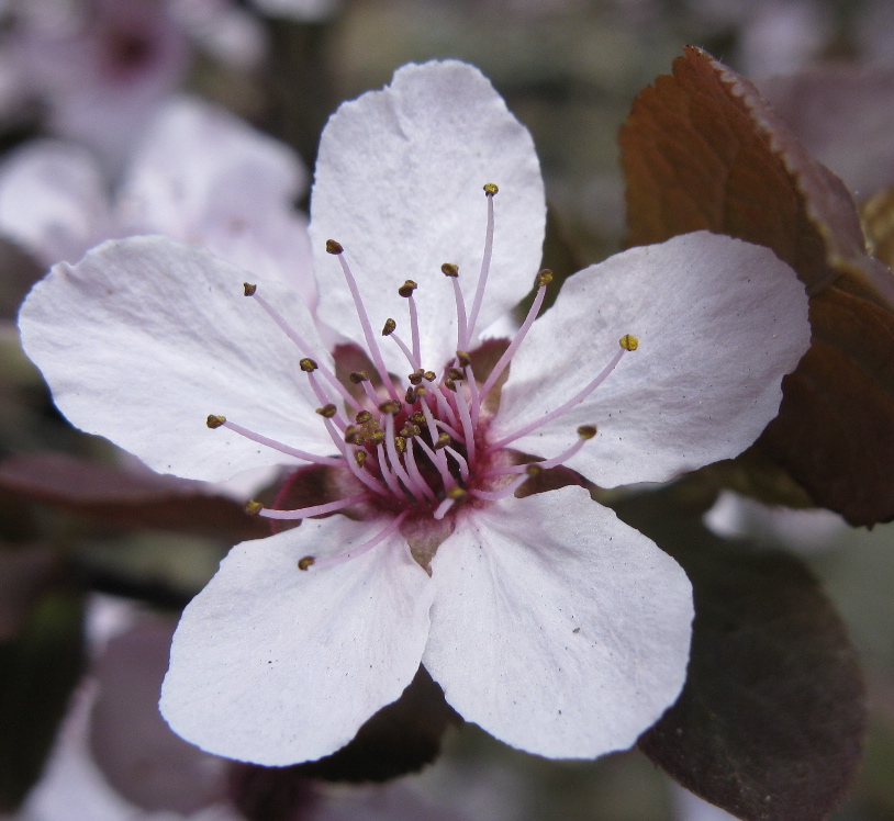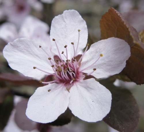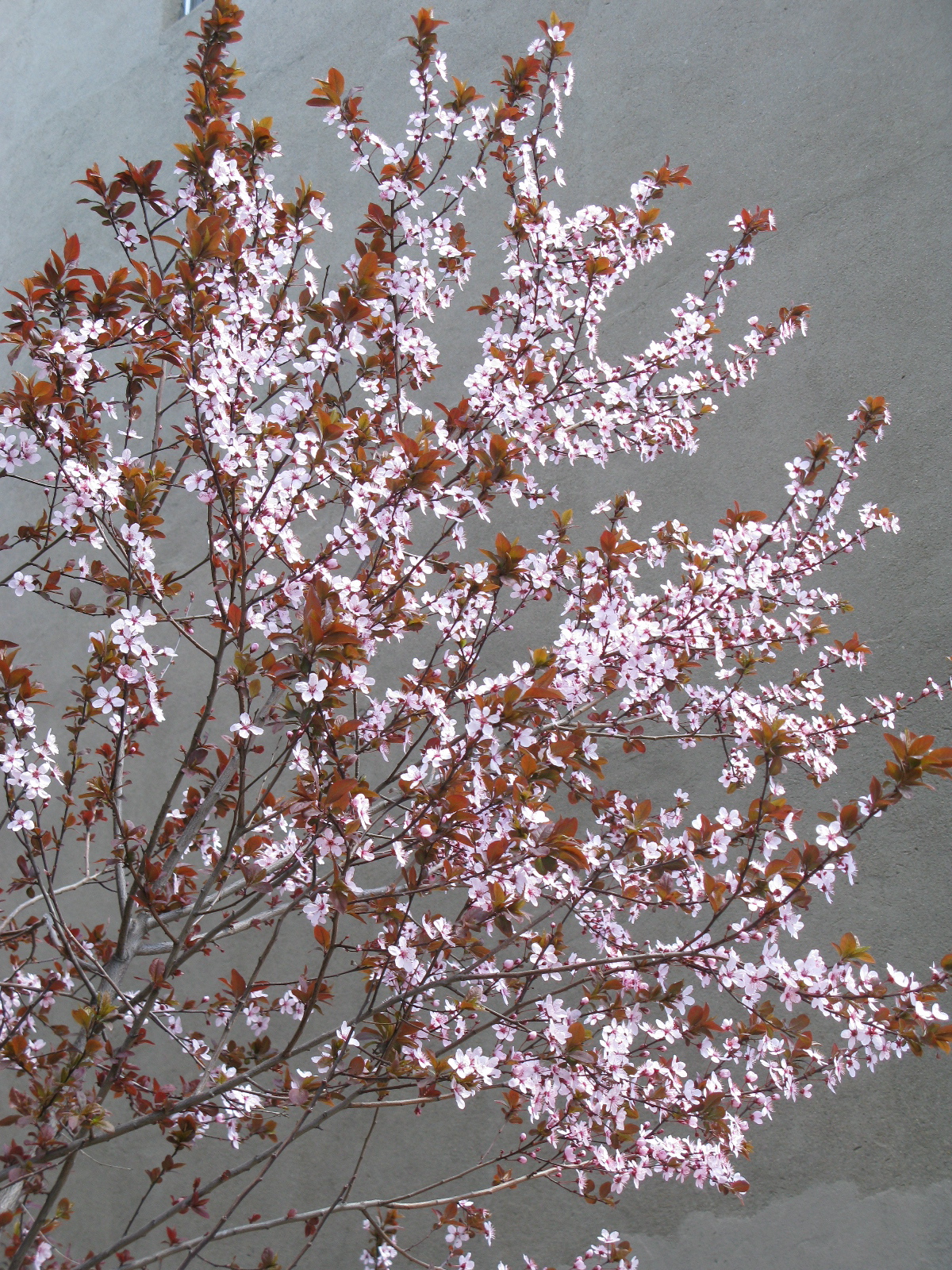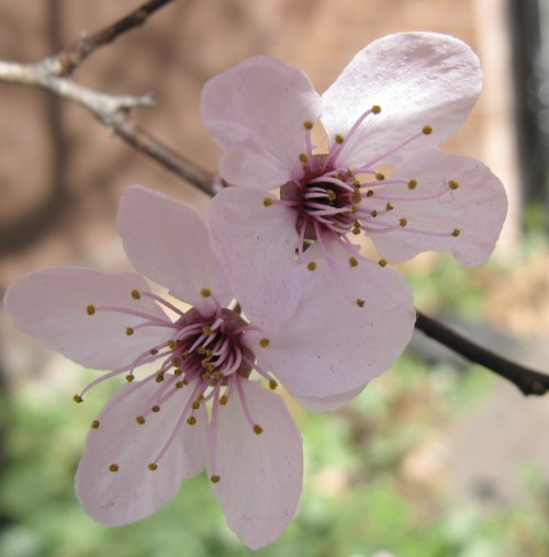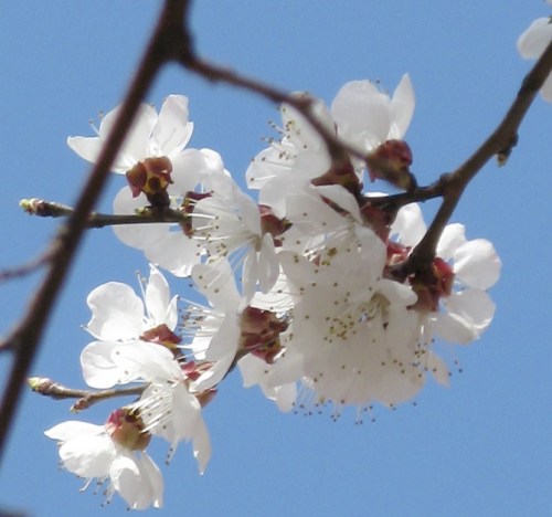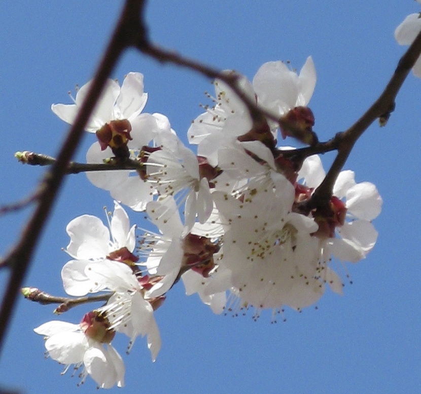 About two weeks earlier than last year, the fruity ornamentals amongst us have erupted. Genus Prunus of the family Rosaceae encompasses the cherries and plums, and cherry plums, and apricots, and quinces, and even peaches — Callery pears also blooming now are another genus w/in Rosaceae– and these small-blossomed beauties are out and about now all over the place, from around the corner…