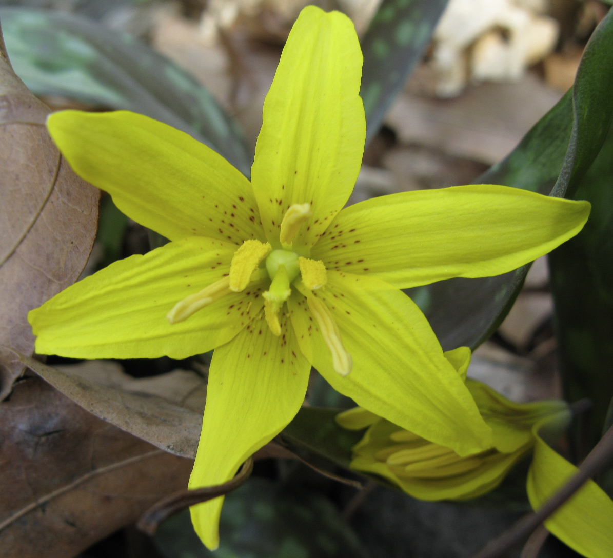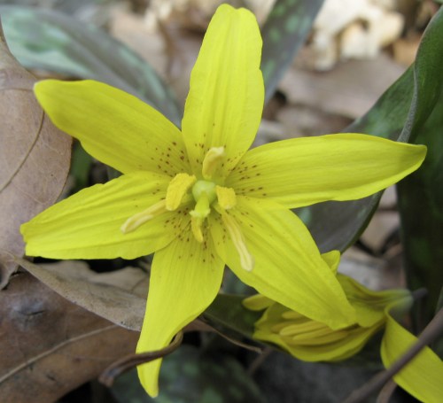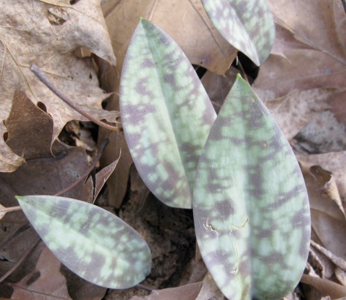 Trout Lily, a.k.a. Yellow Adder’s Toungue (!) Erythronium americanum. Lots of these handsome, mottled leaves poking out of the carpet of leaf litter. Note that the particular plants above are single-leaf. It’s the ones with two leaves that produce a flower: