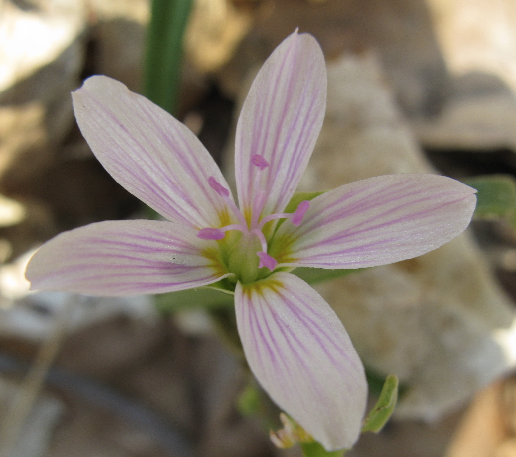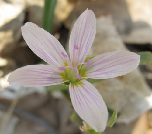 And this is the eponymous Spring Beauty, Claytonia virginica. Quintessential wildflower: small — about 3/4ths inch long — and with its pink lines, lovely.